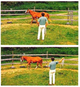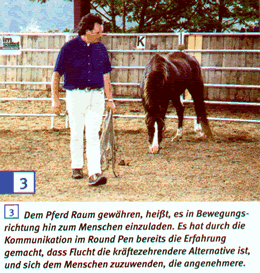 wenig Energie zum Gewünschten Wir bieten dem Pferd im Round Pen das Gegenteil an: Wir gewähren ihm so lange Raum, bis es stehen bleibt. Dadurch, dass wir den Raum vergrößern, bedienen wir uns seines eigenen, natürlichen Sicherheitskonzepts: Raum zu haben bedeutet Sicherheit für das Pferd. Der Effekt ist außerordentlich. Und nebenbei lernen Mensch und Pferd gemeinsam, immer nur so viel Energie aufzuwenden wie nötig. Der energiesparende Umgang wird für beide auf Dauer zur guten Gewohnheit. |