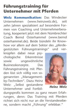 Bewusstheit und Wachheit. Mit einem Wort: mehr Lebensfreude. Im Zentrum dieser „Reise“ zu Vertrauen und Lebensfreude steht der innere Dialog mit uns selbst. Aus diesem Dialog heraus, der auf der körperlichen, geistigen und seelischen Ebene geführt wird, entwickelt sich alles Weitere. Wir verfolgen die Spur des Gesprächs auf allen drei Ebenen, entschlüsseln seine Botschaften, filtern die Kernbotschaft heraus und skizzieren die Wege zu ihrer Erfüllung. Zusätzlich folgen wir der Spur auch in Meditationen, Spielen und in Einzelsitzungen. Der Kurs wird von Sabine und Heinz Welz gemeinsam geleitet und gestaltet. * Falls wir Pferde miteinbeziehen, benötigen die Teilnehmer keinerlei Kenntnisse über Pferde und keinerlei Fähigkeiten, mit Pferden umzugehen. Sie brauchen die Pferde nicht einmal anzufassen. * „Pferd und Lebensfreude“ heißt jetzt nur noch „Lebensfreude“, um keine falschen Erwartungen zu wecken: nämlich dass das Pferd in diesem Seminar zeitlich eine Hauptrolle spielt. Manchmal nehmen wir Pferde dazu, manchmal nicht. Das Seminar „Lebensfreude“ entwickelt sich beständig weiter. In den letzten Seminaren ging es nur noch um die Reise nach innen: zu unserer wichtigsten Kraftquelle, aus der alles schöpft. Auf dem Weg dahin geht Heinz mit dem Klienten - im Rahmen der Gruppe, aber in Einzelarbeit - der Tiefenstruktur (s)einer Aussage(n) nach. Er greift Schlüsselbegriffe auf, deren - möglicherweise - zentrale Bedeutung den meisten selbst nicht auffällt, und läßt sie ihn selbst in Trance überprüfen und entschlüsseln. Dabei entsteht ein „inneres“ Psychodrama mit „Happy End“, bei dem selbst die „Schurken“ eine im Grunde segensreiche Rolle spielen. Zu unserer Überraschung war auch teilnehmenden Psychotherapeuten und Psychiatern dieser Weg neu. Möglicherweise kommt Heinz bei dieser Arbeit seine Textsensibilität als ehemaliger Literaturwissenschafter zugute. Technisch werden Verstand und Gefühl einerseits von der Intuition andererseits unterschieden. Es handelt sich im weitesten Sinne somit auch um ein Intuitionstraining. Ziel ist es, dass die Teilnehmer lernen, diesen Weg nach innen selbständig zu gehen, dabei die typischen Fallstricke auf dem Weg zu identifizieren und ihre inneren Helfer kennen zu lernen. Thematisch kommen die Menschen ins „Lebensfreude“-Seminar und zum „Power-Coaching“ aus unterschiedlichsten Gründen: private und berufliche Konflikte; Krankheit; Verstimmtheit; um Zielsicherheit zu gewinnen; oder einfach nur, um neue Perspektiven zum Leben kennen zu lernen. Weitere Stimmen