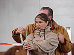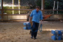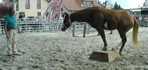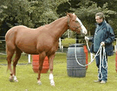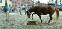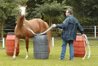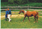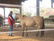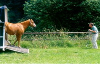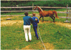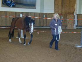 Einfach himmlisch: grenzenloses Vertrauen. Wenn die Kommunikation auf die Entfernung (ca. 4-m-Seil) klappt, funktioniert sie bald auch am 7-Meter langen Seil und dann "drahtlos": Unser Partner folgt uns, reagiert auf jede unserer Bewegung wie denen der Leitstute oder dem Leithengst. Ergebnis: das Pferd ist entspannt und konzentriert zugleich. Warum? Es ist sich unserer ganz sicher. In diesem Kurs geht es darum, Pferde auch auch größere Entfernungen zu lenken: vorwärts, seitwärts, um uns herum; über und unter Hindernisse hindurch und an Hindernissen vorbei. Wo das gut und leicht funktioniert, ist die Basis dafür geschaffen, das Pferd frei in alle Richtungen zu bewegen: auch über und auf Hindernisse, vielleicht frei in einen Pferdehänger oder auf ein Podest. Dabei handelt es sich nicht um Zirkuslektionen (obwohl Laien es dafür halten können), sondern um Könnerschaft für absolut sicheren Umgang mit Pferden und totales Vertrauen zwischen Mensch und Pferd. |