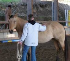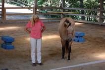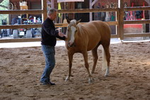 Bei der Einzelarbeit im Round Pen am Samstag und Sonntag lernt er überdies seine Körpersprache und die von Pferden kennen. Mensch und Pferd finden gemeinsam auf einen Weg, einander zu respektieren. Im Kern finden sich leise Anklänge an Monty Roberts' "Join up"-Training, das jedoch erheblich modifiziert und um viele Aspekte von Kommunikation und Körpersprache ausgeweitet wird. Der Freitag steht im Zeichen von gegenseitigem Kennenlernen, theoretischem Hintergrund und ersten gemeinsamen Trockenübungen. |