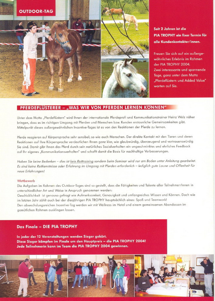 Im ersten Teil dieses Seminars erfahren Sie, welche verblüffenden Parallelen es zwischen Pferden und Menschen gibt, und wie Sie dieses Wissen in Ihrer Kommunikation mit Menschen - Mitarbeitern, Kunden, Vorgesetzten, Partnern, Freunden - effizient einsetzen können. Im Zentrum der Betrachtungen des zweiten Teils steht das "Herz", jenes menschliche Organ, das in der Menschheitsgeschichte einen eminenten Symbolcharakter erhalten hat. In der Kulturgeschichte des Herzens (und seinem heutigen Stellenwert) zeigt sich der Ansatzpunkt für jegliche Neugestaltung von Beziehungen - nach außen ebenso wie nach innen. Lassen Sie sich vom Pferd "helfen", Ihr Herz zu öffnen. Werfen Sie einen Blick in Ihr Herz. Es hat Ihnen mit Sicherheit viel zu sagen! Mehr Infos |