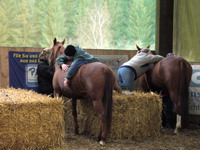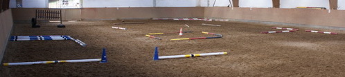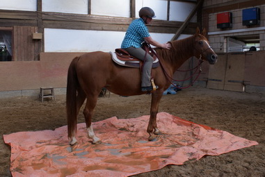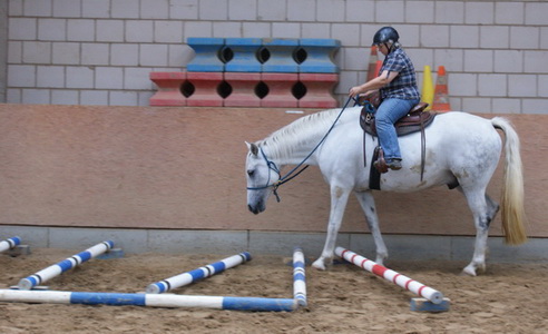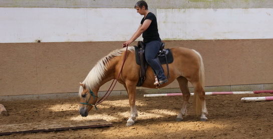 diesen Kurs vorgesehen ist, orientiert sich an der gleichnamigen Westernreiter-Turnierdisziplin. Es geht dabei um feines Reiten in allen drei Gangarten (Ziel: Galopp): guter Sitz, präzise Schenkel, richtige Zügelführung und um Manöver, die der Westerndressur "Reining" ähnlich sind, die aber nicht auf Rasanz geritten werden, sondern auf Feinheit und Präzision. Während bei den vorangegangenen Reitkursen eher Techniken der Einwirkung auf das Pferd im Vordergrund standen, rückt hier der Reiter ein wenig mehr in den Fokus. Für die Horsemanship wird ein Parcours abgesteckt mit mehreren Pylonen an unterschiedlichen Stellen der Reitbahn als Orientierungsmarken für den Reiter. Bei den Pylonen wird unterschiedliches vollführt: sauber auf den Punkt anhalten; Richtungswechsel, evtl. Galoppwechsel (fliegend oder einfach); Hinterhand- und Vorhandwendungen; Seitwärtstritte; rückwärtsrichten. Die Pylone dienen überdies als Orientierungsmarken für präzise Zirkel. Feinheit, Sauberkeit, Präzision und fließende Bewegungen, pferdegerechte Zügelführung bei allen Manovern, eindeutiges, klares Führen des Pferdes durch Sitz, Schenkel und Zügel werden dabei geübt. Wer will (oder nicht anders kann), darf auch mit Gebiss antreten. Hier ginge es dann wieder vor allem um pferdegerechte Zügelführung. |